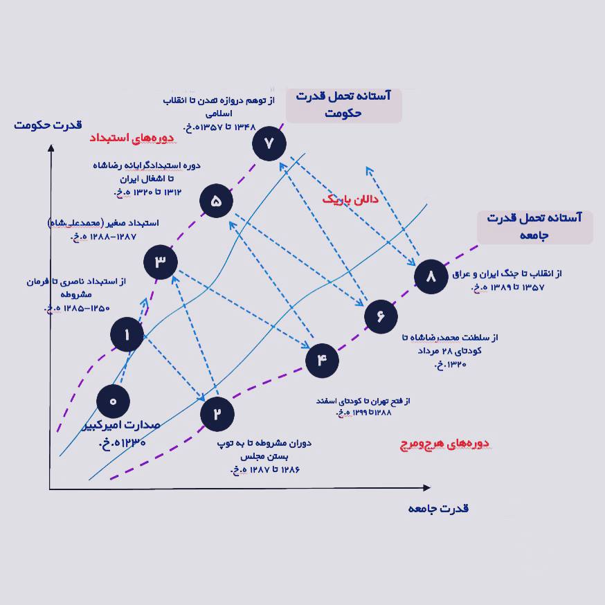 این حرکتهای زیگزاگی در میانهی دو دیوارهی صخرهای، تکرار اصلی در تاریخ ایران بوده. دورههای متعددی از هرجومرج و استبداد ایران را تبدیل به جامعهای آونگی (پاندولوار) کرده است. این تکرارها فرصت حرکت آرام در میان دالان باریک را از ما ربوده و با ضربههای متناوب سخت، ما را در میانه دو دیواره گروگان گرفتهاند. در این الگوی تکراری، حکومتها آنچنان به سرعت به سمت بیشترین حد قدرت حکومت حرکت میکنند و از تمامی سازوکارهای استبدادی برای تمرکز قدرت بهره میبرند که سرنوشت محتوم ایران ضربههای سختِ مکرر میشود.