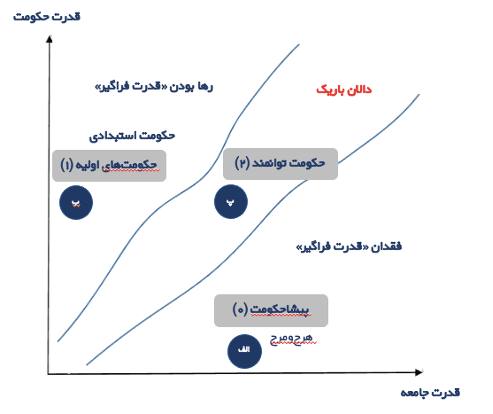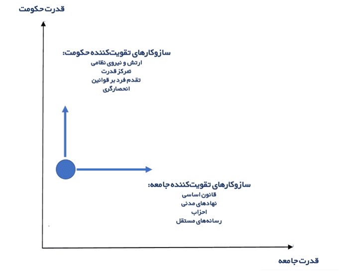همانگونه که در شکل مشخص است، هر جامعه یا کشوری را میتوان بر اساس این دو قدرت، جایابی کرد. برای نمونه، نقطة تعیینشدة فرضی در نمودار بالا، نشاندهندة قدرت متوسط حکومت و قدرت پایین جامعه است. به موازات آن، میتوان سازوکارها و ابزارهایی را شناسایی کرد که امکان افزایش قدرت حکومت یا جامعه را داشته باشند. مثلاً تدوین قانون اساسی میتواند سازوکاری برای افزایش قدرت جامعه باشد و وضعیت جامعه را تغییر و به سمت راست تصویر حرکت دهد. البته این سازوکار به تنهایی برای ایجاد تعادل کافی نیست؛ مجموعهای از سازوکارها میتوانند بخشهایی از قدرت حکومت را به سمت جامعه جابهجا کنند. برخی از سازوکارهای تقویتکنندة قدرت حکومت نیز در این تصویر مشخص شدهاند. انحصار خشونت در دست حکومتها (مثلاً ممنوعیت فروش اسلحه) یکی از نمونههای شناختهشدهای است که میتوانند قدرت حکومت را افزایش دهند. به این ترتیب، تعادل حاصل مجموعهای از سازوکارهای مختلفی است که هر کدام قدرت را میان حکومت و جامعه تقسیم میکنند و از دل این تقسیم، توازن و تعادل مناسب شکل میگیرد.