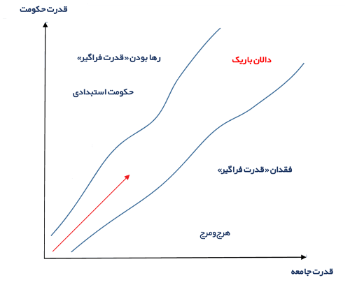 از سوی دیگر، رها کردن «قدرت فراگیر» و نبودن هیچ قیدوبندی بر آن منجر به شکلگیری حکومتهای استبدادی میشود. «دالان باریک»، در میانة مسیر، همان «فرصت توسعه» است. جامعهای میتواند به توسعه دست یابد که این توازن و «راه رفتن روی مرز باریک» را یاد گرفته باشد؛ اینکه چگونه تعادل خود را در مسیر حفظ کند تا به سمت هیچکدام از قدرتها نیفتد.