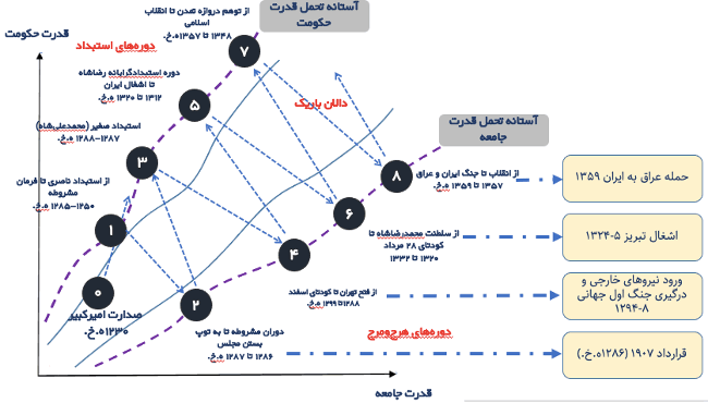 در فصل سوم کتاب مفهوم «ضربههای سخت» ارائه شده است. و در فصل۴ به این واقعیت تلخ در تاریخ توسعهی ایران پرداخته شده است که پس از هر ضربهی سختی، فرصت برای حملهی خارجی فراهم شده است و ایران درگیر جنگ شده است. به عبارت دیگر با کاهش قدرت حکومتها، هرج و مرج افزایش یافته است و درست در همین زمان، ایران مورد تهاجم خارجی قرار گرفته است. به عبارت دیگر گذر کردن حکومتها از آستانهی تحمل جامعه، منجر به زمینهسازی برای هجوم خارجی میشود. این امر مسالهی استبداد داخلی را با تهاجم خارجی پیوند زده است. یا به زبان دیگر، مستبد ایرانی، همان کسی است که خوشآمدگوی حملهی خارجی میشود. در ادامه مهمترین تجربههای حمله نظامی خارجی در تاریخ ۱۰۰ ساله گذشتهی ایران از همین زاویه نگریسته شده است. بخشی از کتاب که به این واقعیت تاریخی پرداخته است، در ادامه آورده شده است. تعرض خارجی و زمینههای داخلی آن افتادن در موقعیت هرجومرج فقط پیامدهای داخلی ندارد. هرجمرج موقعیتی است که به رقبای خارجی فرصت بهرهبرداری میدهد؛ چه در قالب بیاعتنایی به حکومت مرکزی و چه در قالب حمله نظامی. به این ترتیب است که در دوران مشروطه و پسامشروطه، ایران در یک جنگ داخلی مورد تاختوتاز خارجی قرار میگیرد. این تاختوتاز میتواند در قالب اقتصادی باشد، مثلاً قراردادهای نفتی یکسویه و خالی کردن انبارهای آذوقه، یا در قالب نظامی و حضور ارتش کشورهای خارجی در ایران. به این ترتیب، با هر ضربه سختی که بر اثر هرجومرج و کاهش قدرت حکومت در برابر جامعه وارد میشود، ایران مورد تعرض خارجی قرار میگیرد. ابتدا پیماننامه ۱۹۰۷ (۱۲۸۶) میان انگلستان و روسیه و تقسیم ایران به دو حوزه نفوذ مورد توجه قرار میگیرد. این پیماننامه، که یک تعرض تمامعیار به حاکمیت ملی ایران است، دقیقاً همزمان با هرجومرجِ پس از امضای فرمان مشروطه (پرده دوم) و شکاف داخلی در دوران محمدعلیشاه است. تعرض دوم خارجی در دوران پسامشروطه و هرجومرج گسترده پس از آن روی میدهد. در این دوران، هم قحطیِ ناشی از جنگ جهانی اول و هم ورود نیروهای درگیر به ایران و ادامه درگیریها در خاک ایران، به رغم بیطرفی ایران در جنگ، دو نمونه مشخص از تعرض خارجیاند. در نمودار زیر، وضعیت تاریخ تعرضات به ایران و ضربههای سخت به صورت خلاصه نشان داده شده است. به عبارت دیگر، چارچوبی که ضربه سخت ارائه میدهد به طرز دقیقی میتواند دلیلی برای تمامی تعرضات خارجی در ۱۵۰ سال گذشته عرضه کند. در ۱۵۰ سال گذشته، ایران با چهار حمله نظامی گسترده مواجه شده است. تمامی این حملهها دقیقاً در زمانهای هرجومرج یا زمانهایی بودهاند که قدرت حکومت کاهش یافته بوده است. این تعرضات بسیار متنوع بودهاند. در مورد نخست، به حاکمیت ملی ایران تعرض میشود؛ به موازات آن، نیروهای نظامی این کشورها وارد ایران میشوند. در تعرض دوم، یعنی ورود نیروهای درگیر در جنگ جهانی اول به ایران، نیروهای نظامی سه کشور وارد ایران میشوند و درگیریهایی میان آنها رخ میدهد. در هر صورت و فارغ از اینکه کدام طرفِ درگیر برنده میشد، شهروندان ایران بودند که در ردوبدل شدن گلولهها جان میدادند. در این تعرض، انبارهای غذایی ایرانیان نیز خالی میشود. گندم را نیروهای خارجی از کشور خارج میکنند و ایران درگیر بزرگترین قحطی تاریخ متأخر خود میشود. کشتهشدگانِ ناشی از قحطی در ایران از کل کشتهشدگان بسیاری از کشورهای درگیر در جنگ جهانی بیشتر بودهاند. در تعرض سوم، بخشی از خاک ایران، یعنی تبریز، از کشور جدا میشود. شوروی سابق از این جدایی حمایت میکند و به این ترتیب است که ایران در عمل و در میدان نبرد نمیتواند کاری از پیش ببرد و از خوشاقبالی ایرانیان، حل مسئله به دست دیپلماتها میافتد. قوامالسطلنه، نخستوزیر وقت ایران، نقش اصلی را بر عهده میگیرد و میتواند در زمان استالین، قدرتمندترین رهبر شوروی، بار دیگر تبریز را پس از چهار سال به ایران بازگرداند. در تعرض سوم، عراق از هرجومرج پس از انقلاب ایران و ازهمپاشیدگی ارتش استفاده، به ایران حمله و خر